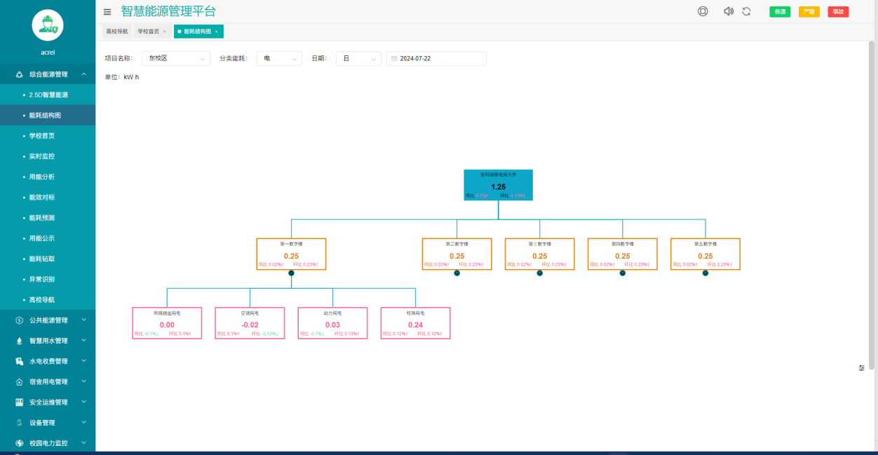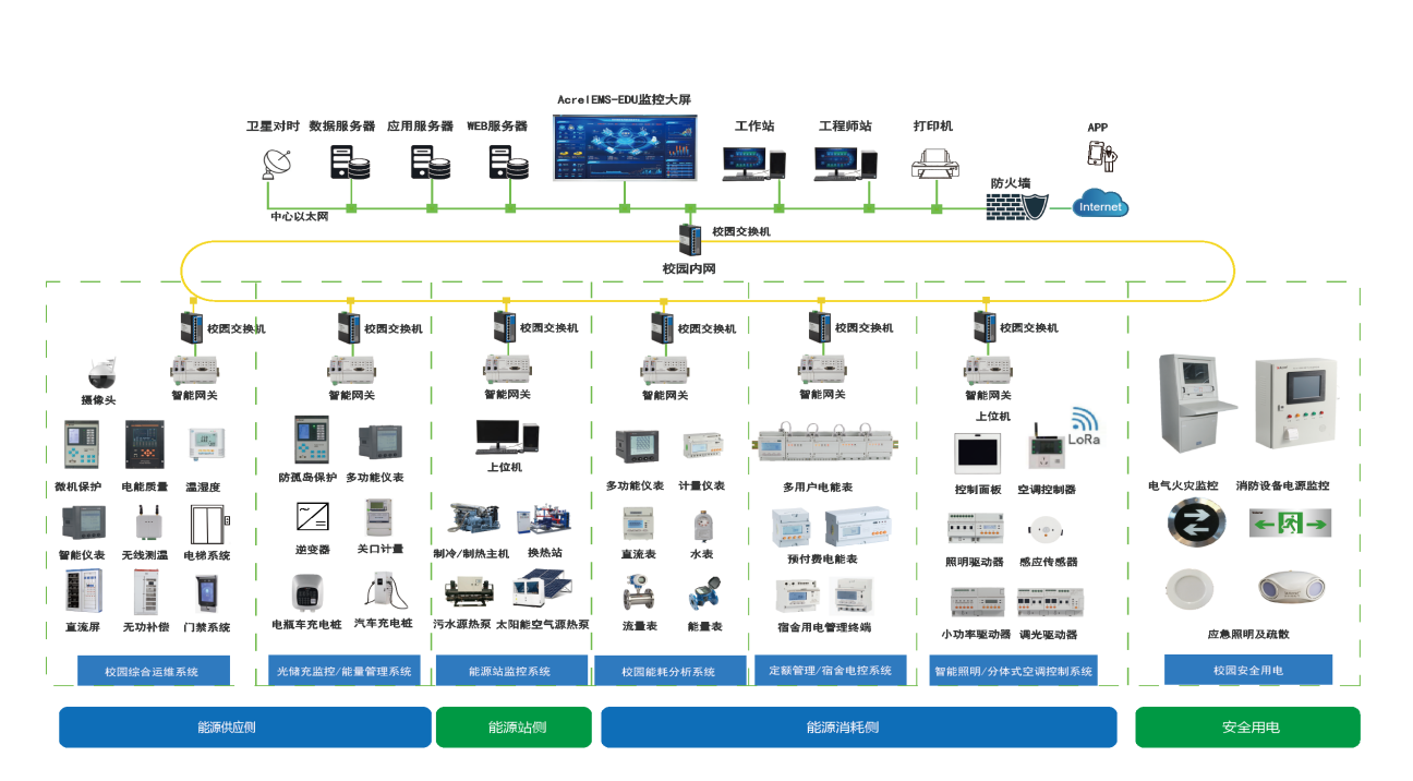 AcrelEMS-EDU校園智慧能源管理平臺[2]集綜合能源管理、公共用能管理、能源漏損監控、水電收費管理、宿舍用能管理、設備運維管理、變配電監控、智能照明、空調監控、電氣消防安全等功能于一體,為高校智慧能源管理系統搭建提供完整的軟硬件方案服務。